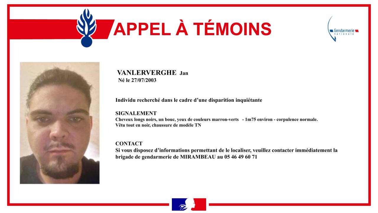 La gendarmerie de la Charente-Maritime a lancé un appel à témoins hier, après la disparition d’un jeune homme de 22 ans. Jan Vanlerverghe a quitté le domicile familial de Lorignac, au sud du département, dans la nuit de dimanche à lundi, vers 3h15. Il est parti sans son téléphone. D’importants moyens ont été engagés pour le retrouver, notamment un hélicoptère et une équipe cynophile, en vain. Voici son signalement : cheveux longs noirs, un bouc, les yeux marron-verts, 1,75m. Le jeune homme, de corpulence normale, était vêtu tout en noir quand il est parti, et portait des chaussures de modèle TN. Si vous avez des informations, vous pouvez contacter le 05 46 49 60 71.