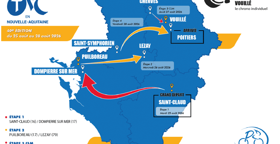Les villes-étapes du prochain Tour cycliste du Poitou-Charentes ont été dévoilées. Ce sera la 40e édition. Celle-ci aura lieu du 25au 28 août 2026, et partira de Saint-Claud en Charente direction Dompierre-sur-Mer, en Charente-Maritime. La 2e étape reliera Puilboreau à Lezay, dans les Deux-Sèvres. La 3e sera un contre-la-montre entre Cherves et Vouillé, dans la Vienne. Enfin, la 4e et dernière étape partira de Saint-Symphorien, dans les Deux-Sèvres, pour une arrivée finale, comme d’habitude, à Poitiers.