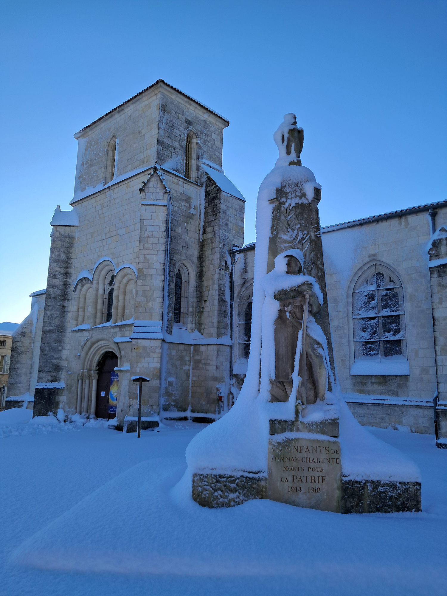L’église Saint-Étienne et le monument au morts recouverts de neige.