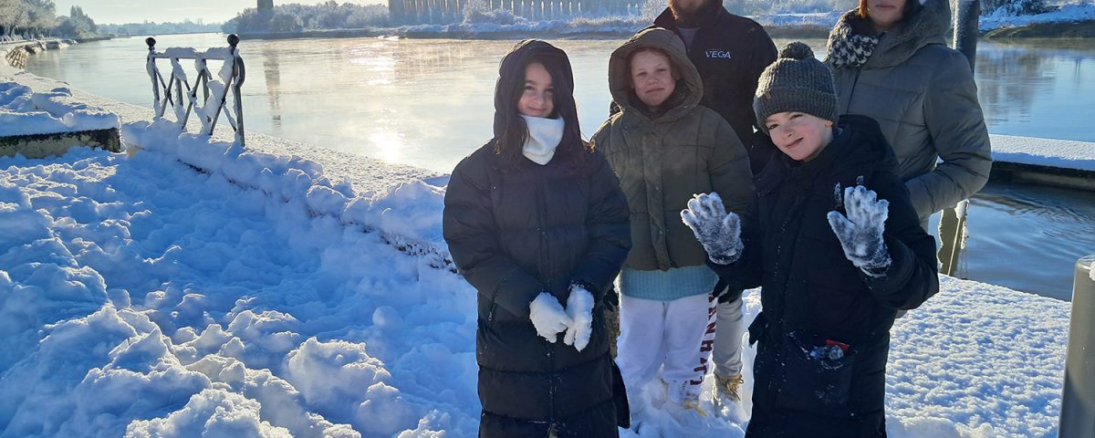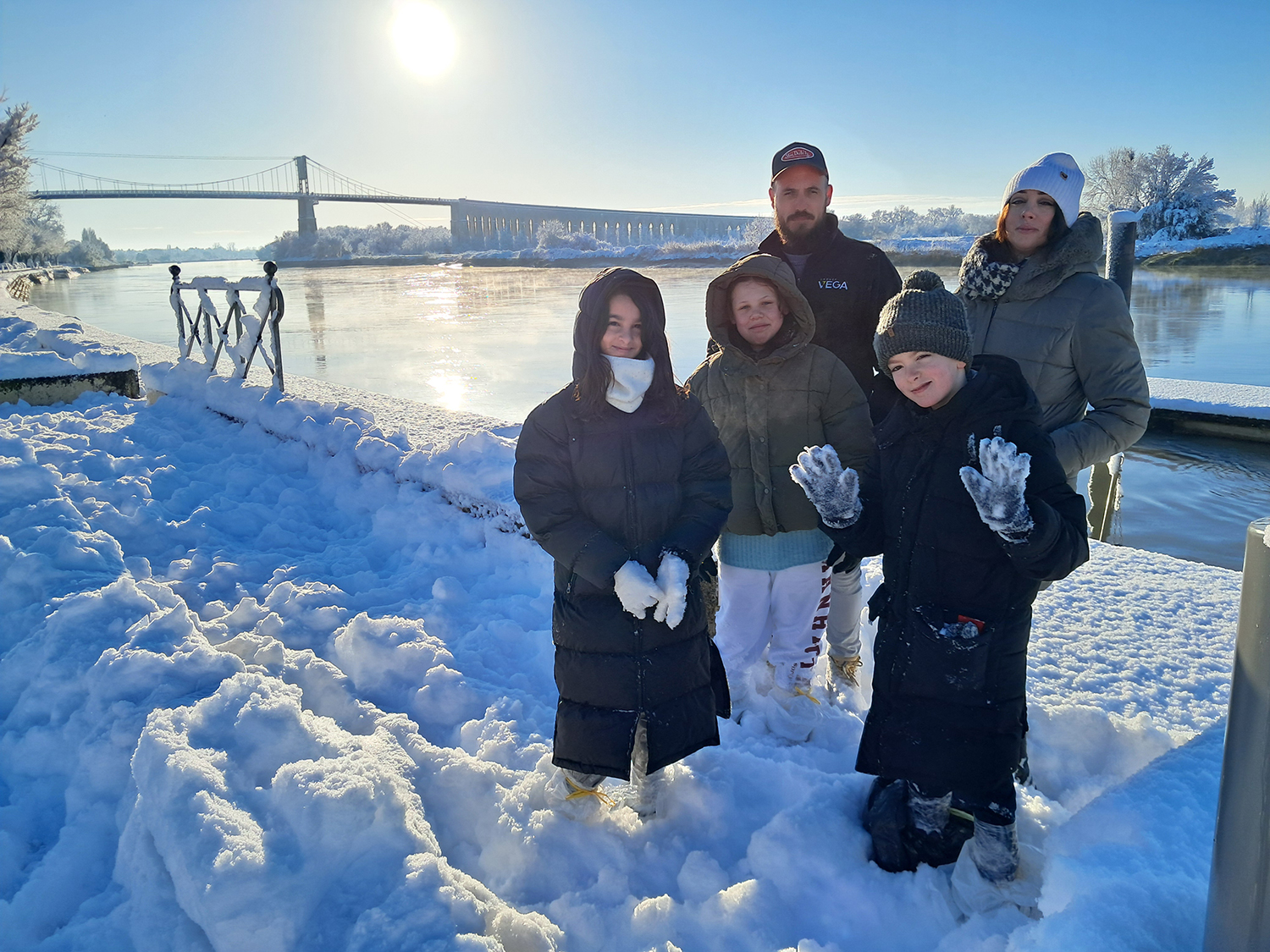 Balade en famille pour Alison, sur les quais enneigés de la Charente.