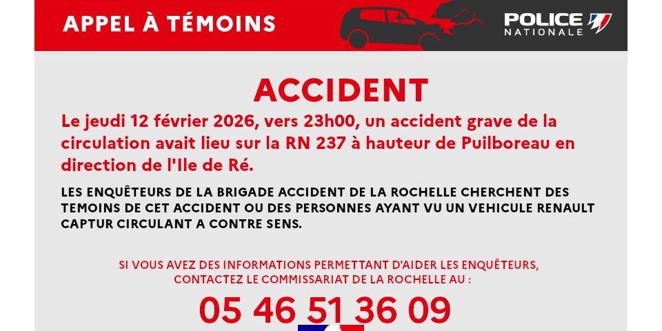 La police lance un appel à témoins après l’accident survenu jeudi dernier sur la rocade de La Rochelle. Pour rappel, un automobiliste de 83 ans, circulant à contresens au volant de son Renault Captur, a percuté une voiture vers 23h, à hauteur de Puilboreau, sur la RN 237. Lui et l’autre conducteur, âgé de 23 ans, ont été légèrement blessés. Le mis en cause a été contrôlé positif à l’alcool. Les enquêteurs cherchent à déterminer les circonstances exactes de l’accident et par quelle bretelle ce dernier a accédé à la voie rapide. Si vous avez des informations, vous pouvez contacter le commissariat au 05 46 51 36 09.