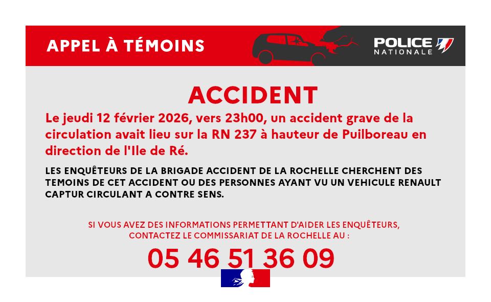 La police lance un appel à témoins après l’accident survenu jeudi dernier sur la rocade de La Rochelle. Pour rappel, un automobiliste de 83 ans, circulant à contresens au volant de son Renault Captur, a percuté une voiture vers 23h, à hauteur de Puilboreau, sur la RN 237. Lui et l’autre conducteur, âgé de 23 ans, ont été légèrement blessés. Le mis en cause a été contrôlé positif à l’alcool. Les enquêteurs cherchent à déterminer les circonstances exactes de l’accident et par quelle bretelle ce dernier a accédé à la voie rapide. Si vous avez des informations, vous pouvez contacter le commissariat au 05 46 51 36 09.