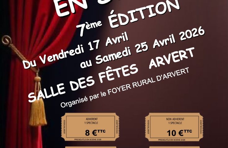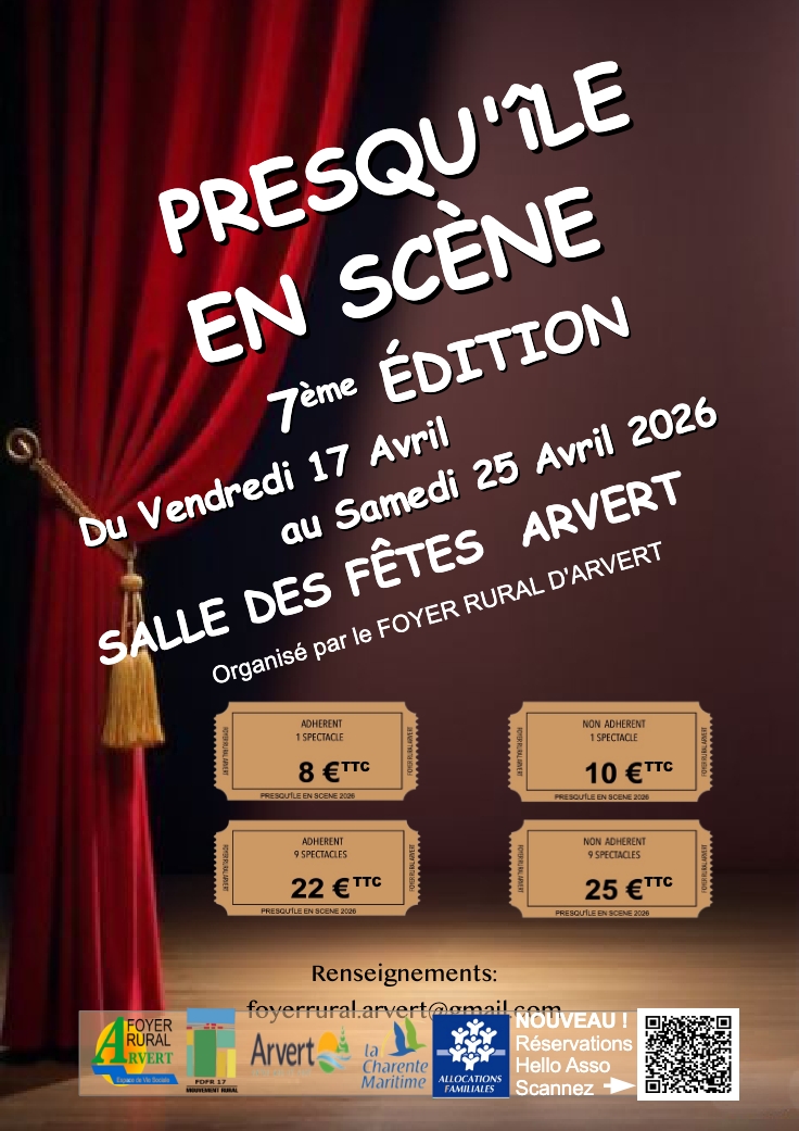 Du 17 au 25 avril, à Arvert, le Foyer rural vous invite à la 7ème édition de « Presqu’île en scène » à la salle des fêtes. Chaque soir, une nouvelle aventure théâtrale vous attend. Tarifs 8€ pour les adhérents et 22€ pour les 9 spectacles et 10€ pour les non adhérents et 25€ pour les 9 spectacles. Renseignements par mail à foyerrural.arvert@gmail.com et réservations sur Helloasso.