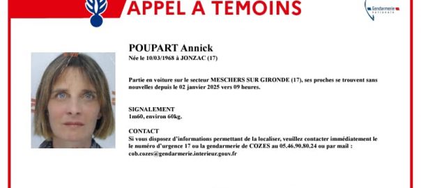 La gendarmerie de la Charente-Maritime a lancé hier un appel à témoins après la disparition inquiétante d’une femme dans le secteur de Meschers-sur-Gironde, près de Royan. Annick Poupart, 56 ans, n’a plusLire la suite…